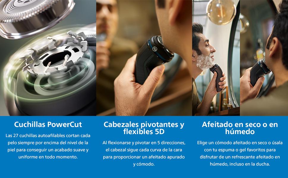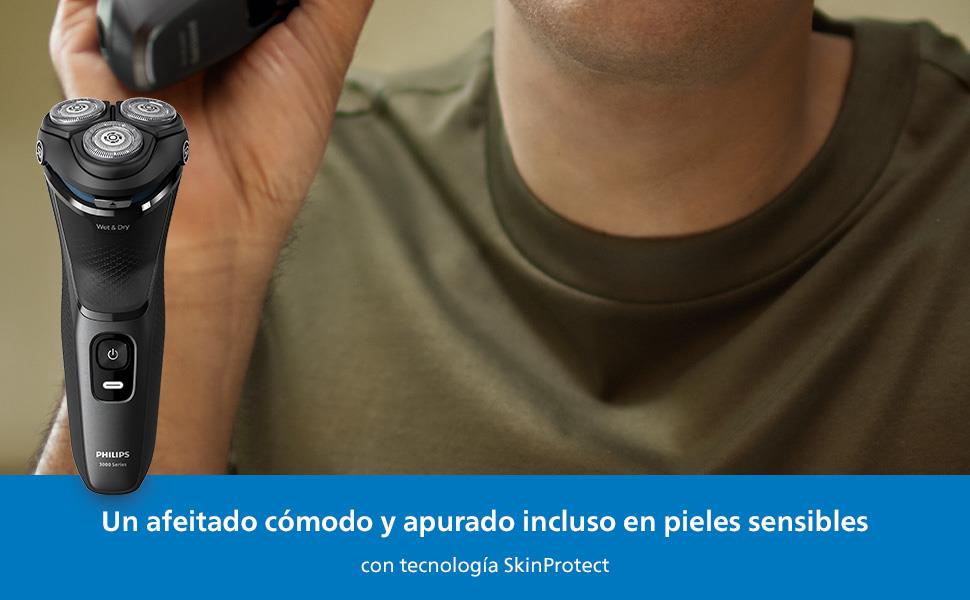 Afeitado cómodo: la serie 3000 de Philips con tecnología SkinProtect ofrece un afeitado suave y preciso gracias a las cuchillas PowerCut autoafilables, cabezales pivotantes 5D y adaptabilidad a seco y húmedo.